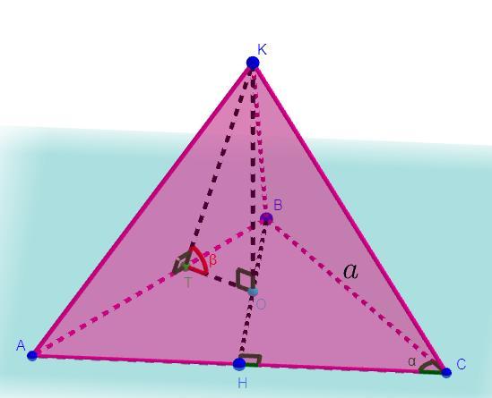 Дано: KABC - пирамида, BC = a, ∠ACB = α, ∠(KAC, ABC) = ∠(KBC,ABC) = =∠(KAB,ABC) = β, OK ⊥ ABC, AB = BC