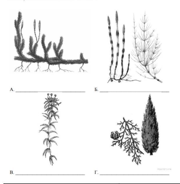 Подпишите их названия, используя слова из предложенного списка: хвощовые, хвойные, плауновые, листостебельные мхи.