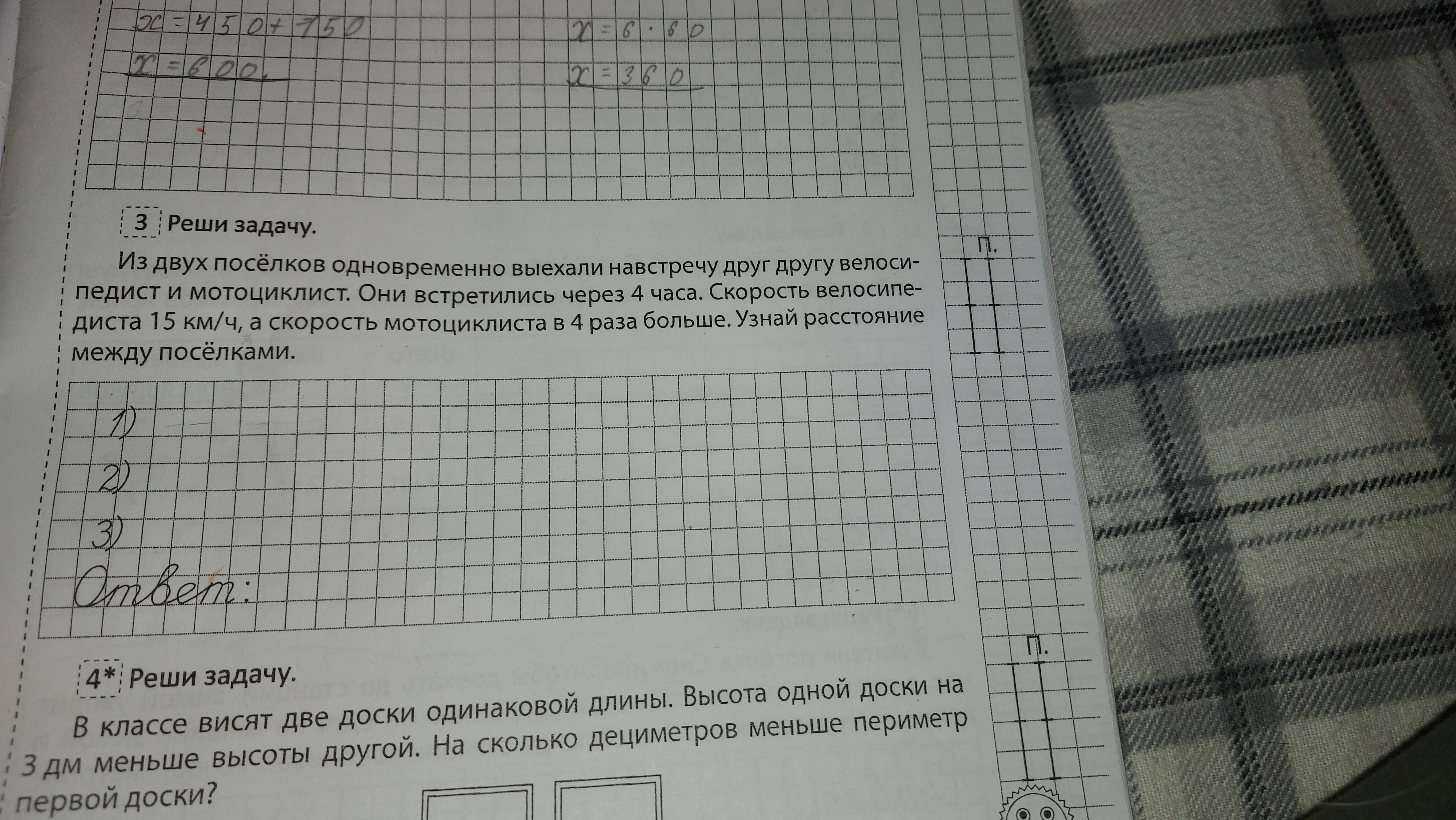 Из двух посёлков одновременно выехали навстречу друг другу велосипедист и мотоциклист. Они встретились через 4 часа. Скорость велосипидиста 15км/ч, а скорость мотоциклиста в 4 раза больше. Узнай расстояние между посёлками
