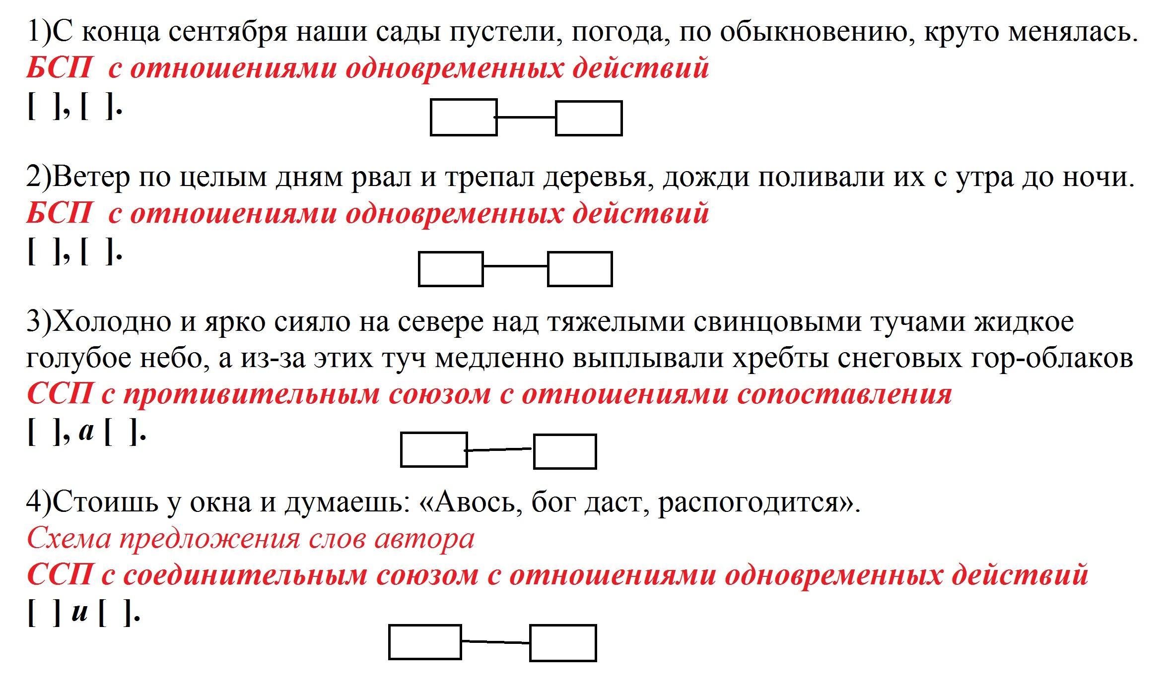 3) [Холодно и ярко сияло== на севере над тяжёлыми свинцовыми тучами жидкое голубое небо__], а [из-за этих туч медленно выплывали хребты снеговых гор-облаков].