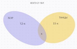 Общее количество учащихся, которые занимаются в кружках по танцам или в хоре равно 21. В хоре поют 12 человек, а танцами 15 человек. Сколько учеников занимаются в хоре , так и танцами? Представьте при помощи диаграммы Венна