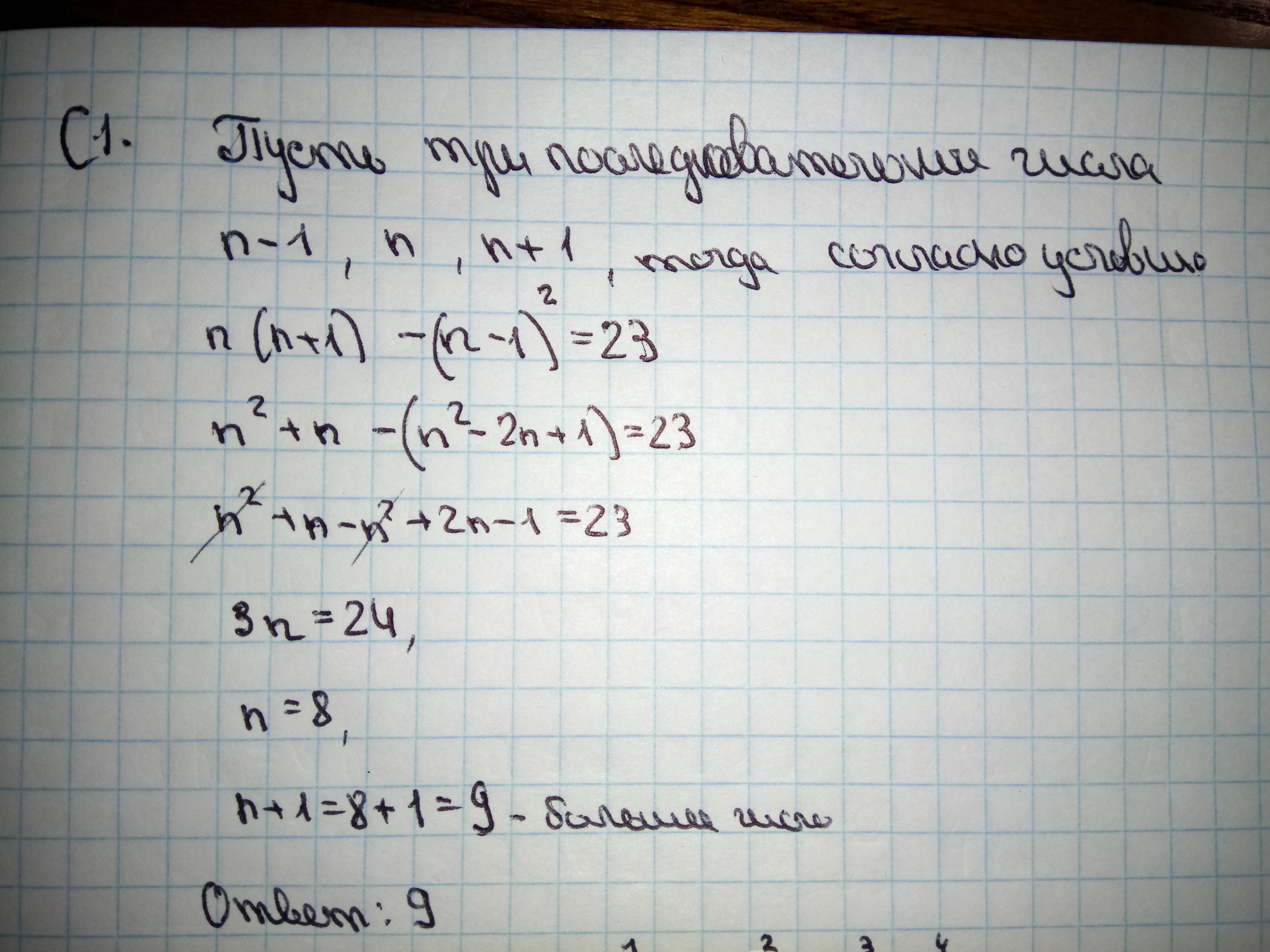 С1. Найдите большее из трех последовательных натуральных чисел, если квадрат меньшего