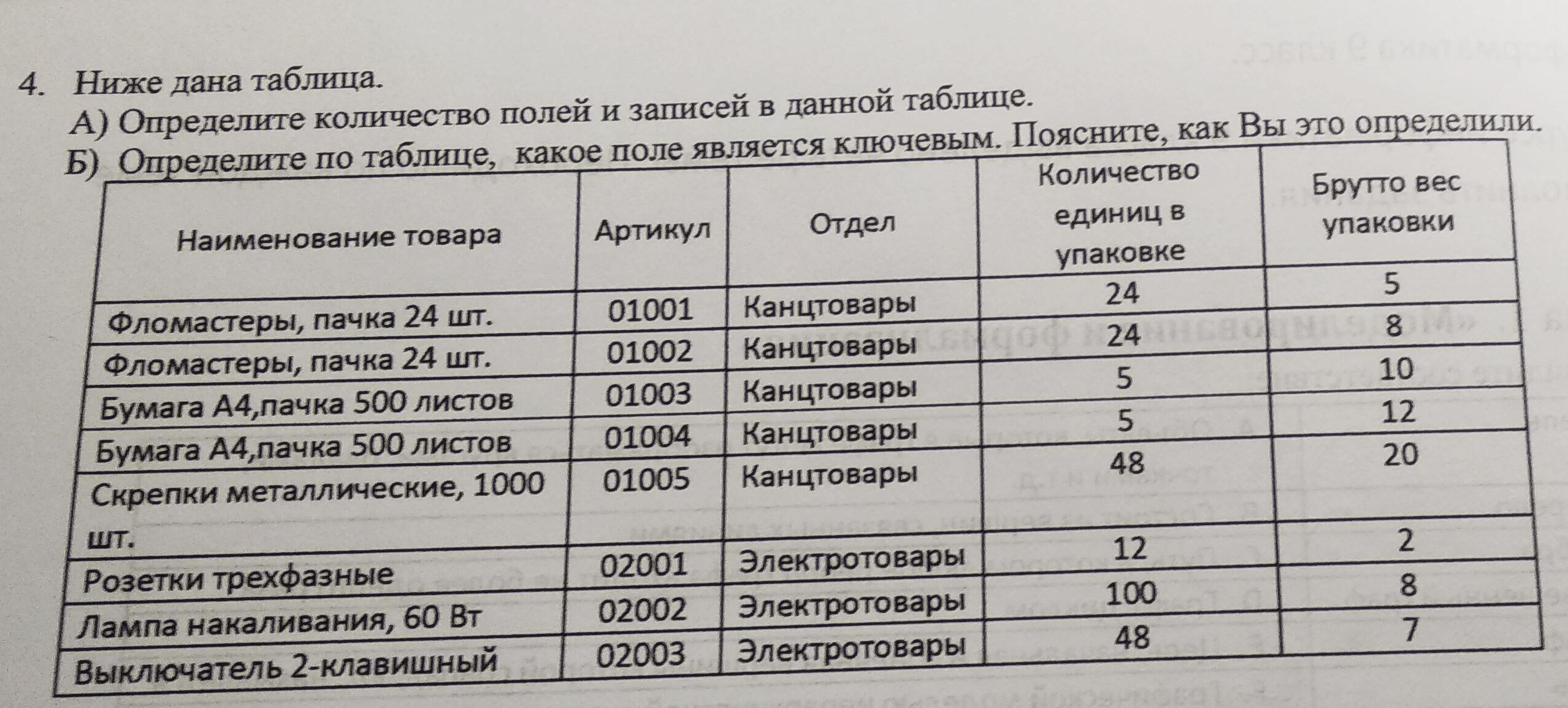 5 полей (столбцы таблицы), записей - 8(строки таблицы). Ключевое поле - артикул(записи в нем не повторяются)