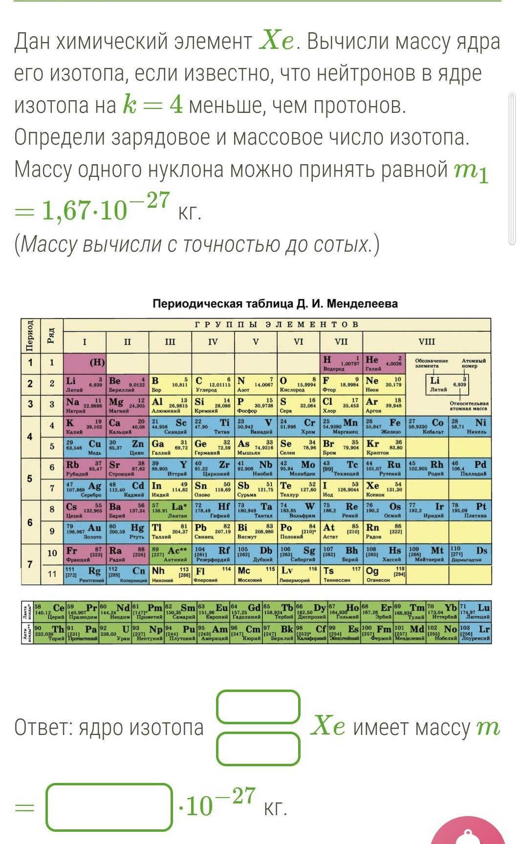 Дан химический элемент Xe. Вычисли массу ядра его изотопа, если известно, что нейтронов в ядре изотопа на k = 4 меньше, чем протонов. Определи зарядовое и массовое число изотопа.