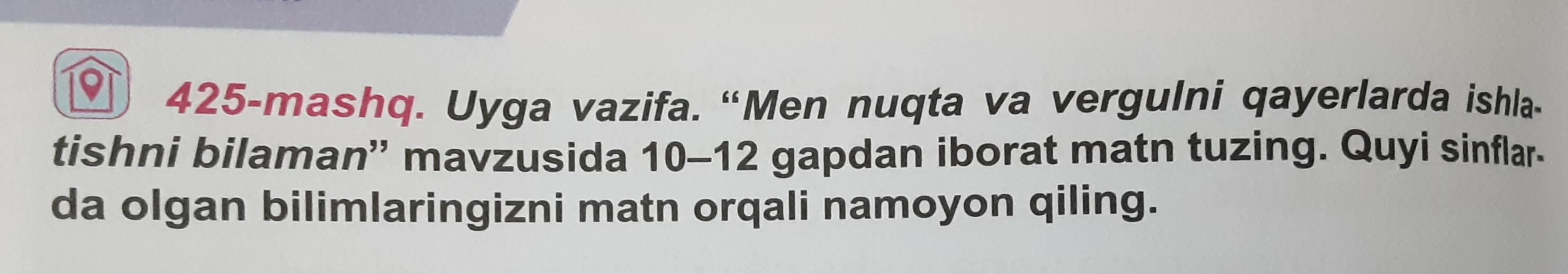 Biz maktabimizda kõp yillardan buyon ilmimizni rivojlantirib kelyapmiz. Oxirgi yillarda biz qaysi holatlarda nuqta va vergul ishlatishni õrgandik. Masalan, nuqta belgisi gap tugaganligini bildiradi. Shuning uchun ham, biz nuqtani gapning oxirida qõyamiz. Vergul belgisi, bu belgi gapdagi biron narsani ajratishda yoki uni ketma-ketligini kõrsatishda ishlatiladi. Biz kimgadir yuzlanib gapirsak ham õsha shaxani vergul bilan ajratamiz(Abror, kitobingni õqi!). Shunday qilib, endi biz qaysi holatlarda qanday tinish belgilarini qõyishni õrganib oldik.