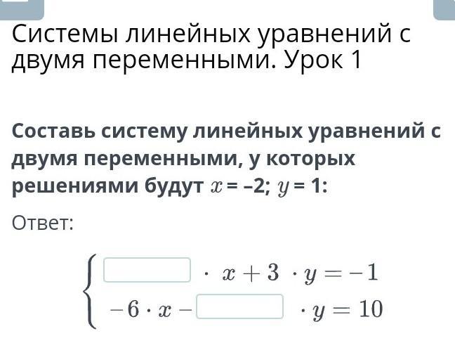 Составь систему линейных уравнений с двумя переменными, у которых решениями будут т =-2; у = 1;