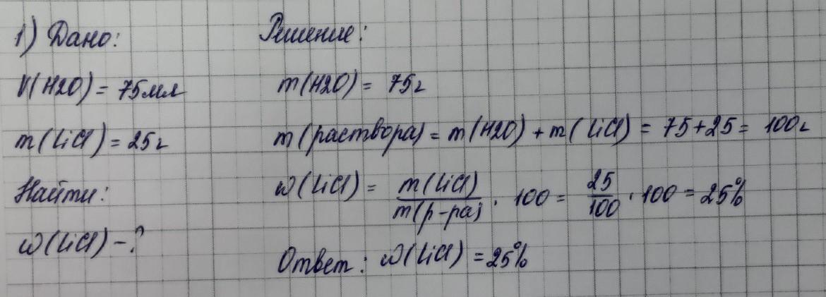 1. У воді об'ємом 75мл розчинили 25г речовини LiCI. Визначте масову частку