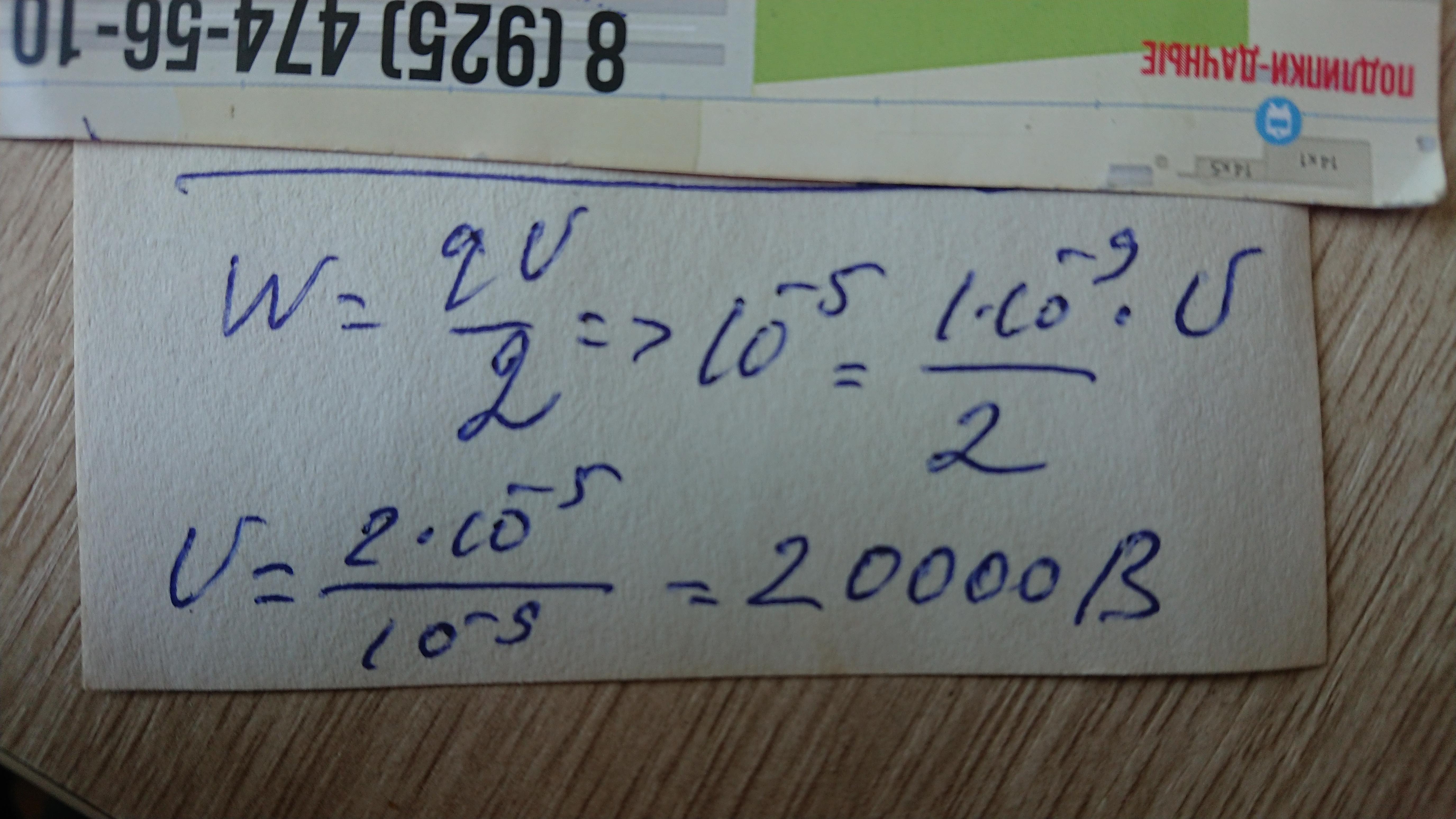 Определите напряжение на конденсаторе, если при сообщении ему заряда 1 нКл конденсатор приобрёл энергию 10 мкДж.