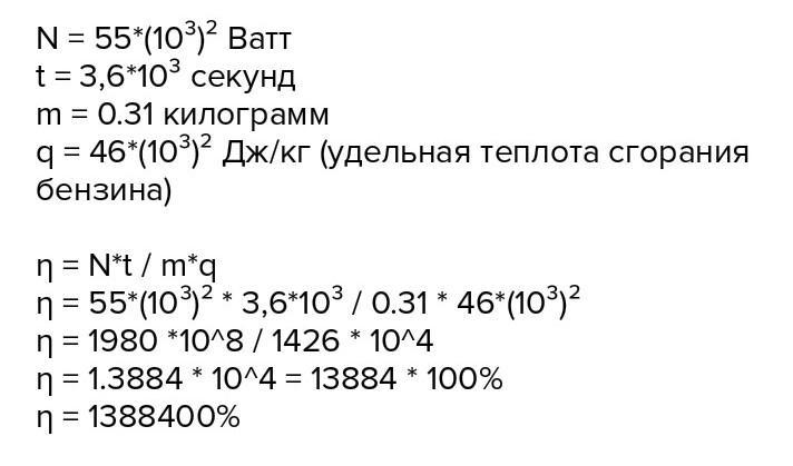 Каков кпд двигателя, если автомобиль "Волга" мощность 55 кВт на 1кВт×час расходует 0,31 кг бензина? Удел. теплота сгорания бензина 4.6* 10^7 дж/кг