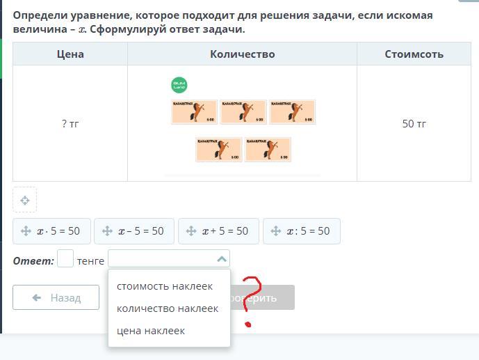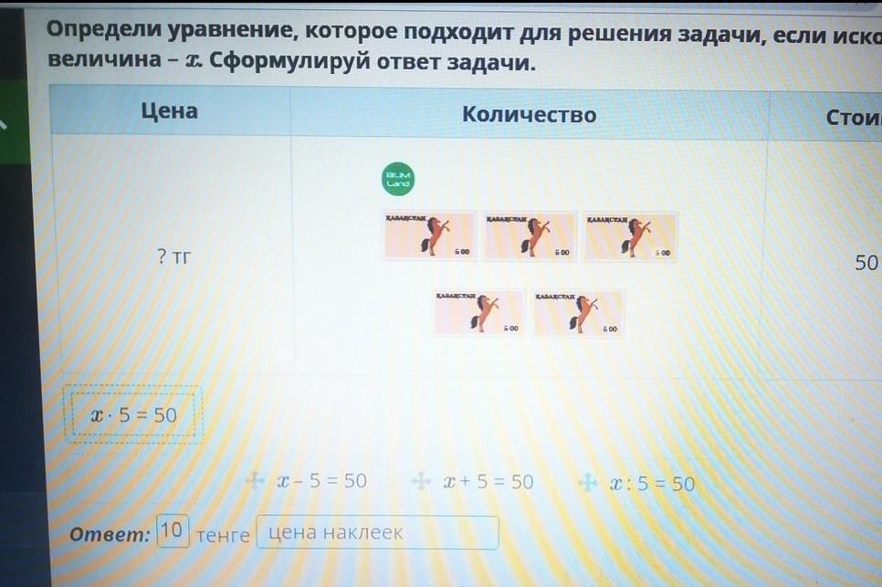 Определи уравнение, которое подходит для решения задачи, если искомая величина – x. Сформулируй ответ задачи.
