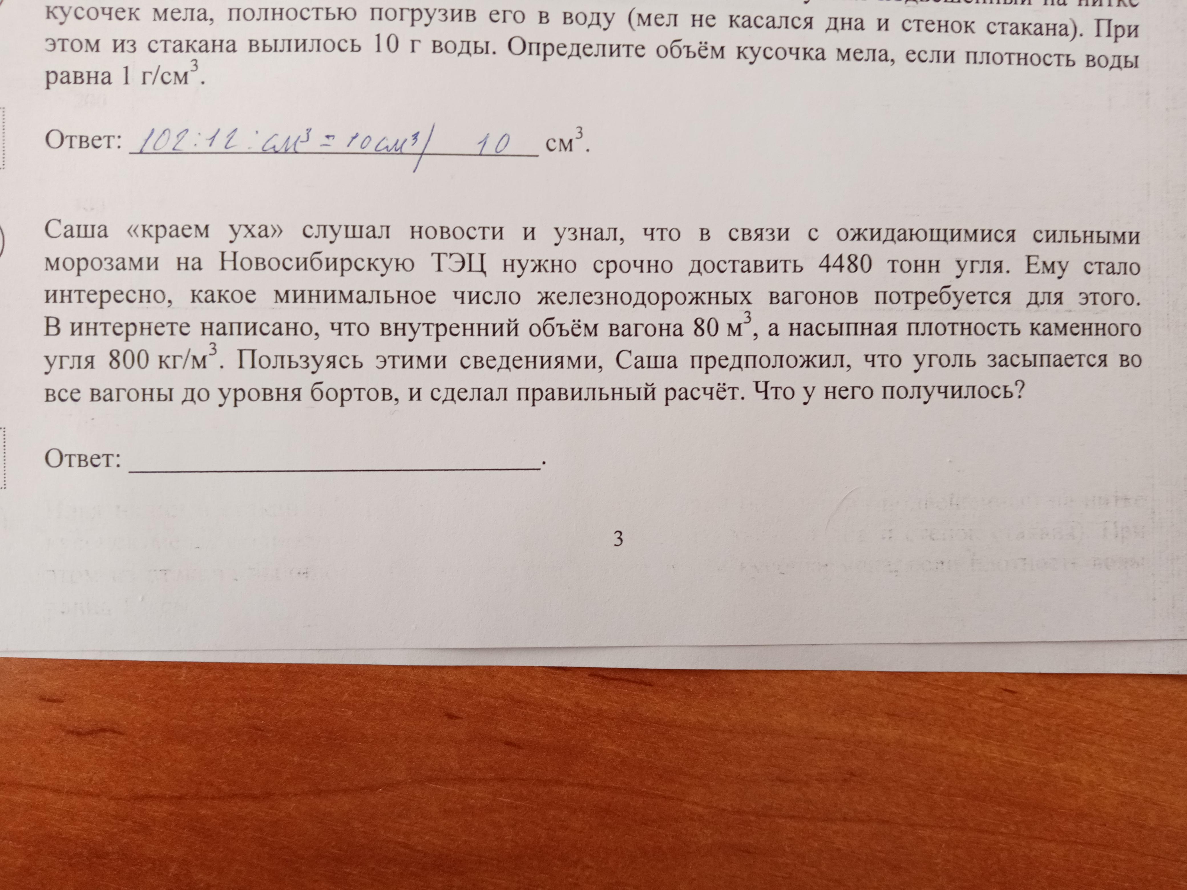 Срочно нужно дамы и господа! Я пропустил тему! 6 задание: Саша краем уха слушал новости и узнал, что в связи с ожидающимися сильными морозами на Новосибирскую ТЭЦ нужно срочно доставить 4480 тонн угля. Ему стало интересно, какое минимальное число железнодорожных вагонов потребуется для этого. В интернете написано, что внутренний объём вагона 80м3, а насыпная плотность каменного угля 800кг/м3. Пользуясь этими сведениями, Саша предположил, что уголь засыпается во все вагоны до уровня бортов, и сделал правильный расчёт. Что у него получилось? Даю 45 баллов!!! ❗❗❗