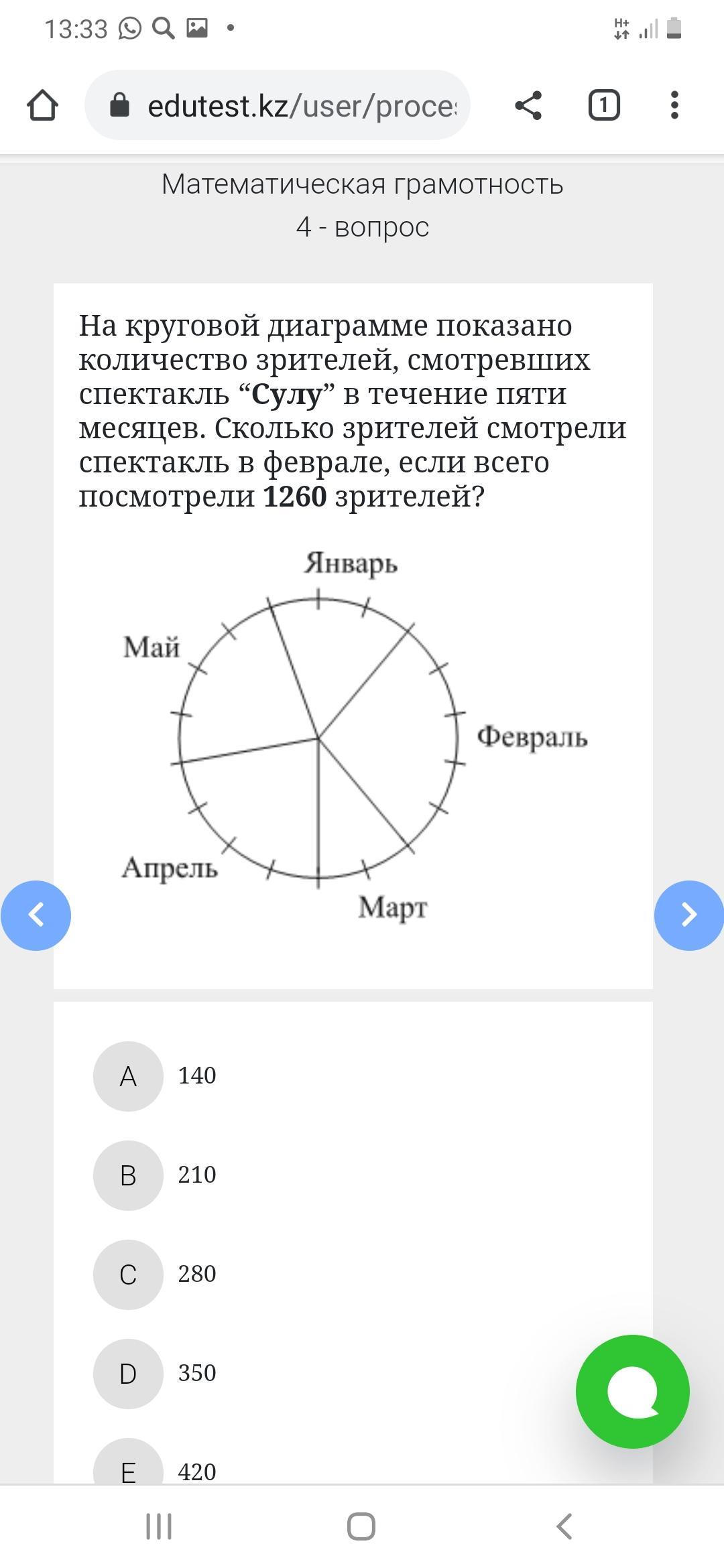 На круговой диаграмме показано количество зрителей, смотревших спектакль “Сулу” в течение пяти месяцев. Сколько зрителей смотрели спектакль в феврале, если всего посмотрели 1260 зрителей?