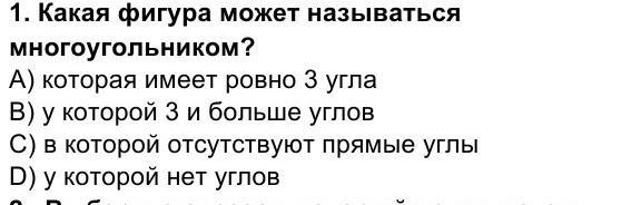 1. Какая фигура может называться многоугольником? A) которая имеет ровно з угла в) у которой 3 и больше углов С) в которой отсутствуют прямые углы D) у которой нет углов 2. Выберите отрезок, который не является одной из сторон данного