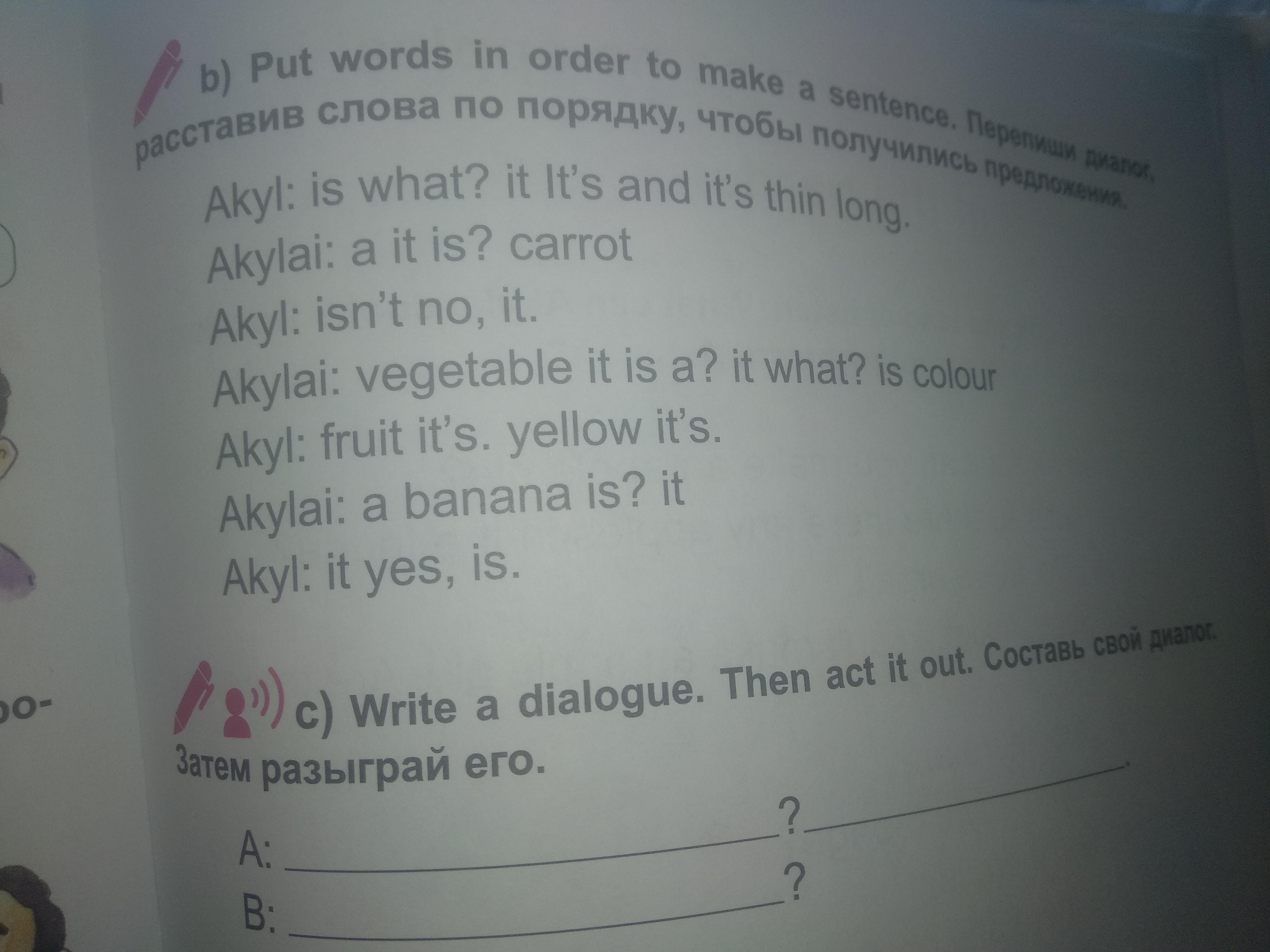 Там написано перепишите диалог расставив слова по порядку,чтобы получилось предложение