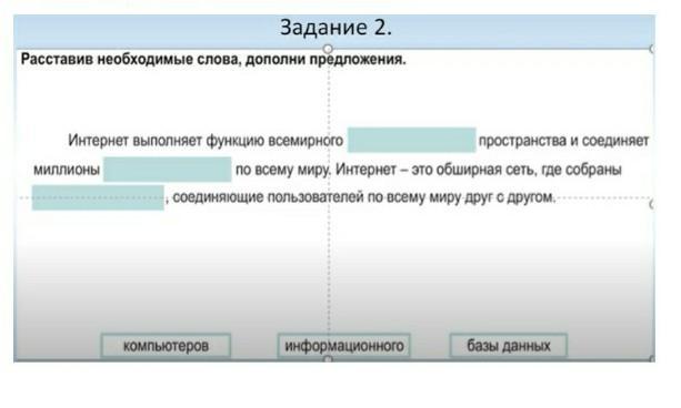 Задание 2. необходимые слова, дополни предложения. Расставив Интернет выполняет функцию всемирного миллионы пространства и соединяет по всему миру. Интернет - это обширная сеть, где собраны соединяющие пользователей по всему миру друг с другом компьютеров информационного базы данных