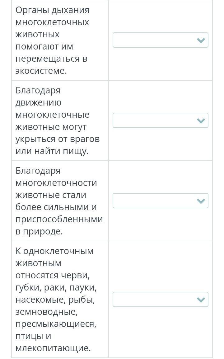 К одноклеточным животным относятся черви, губки, раки, пауки, насекомые, рыбы, земноводные, пресмыкающиеся, птицы и млекопитающие. Помогите мне пожалуйста