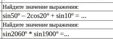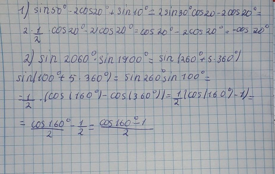 2) 1/2 * ( cos(2060-1900)+cos(2060+1900)) = = 1/2(cos(160°) - cos(3960°)) = 1/2(-sin(20°) -1) = -1/2 * sin(20°) - 1/2