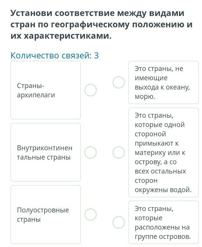Установи соответствие между видами стран по географическому положению и их характеристиками.
