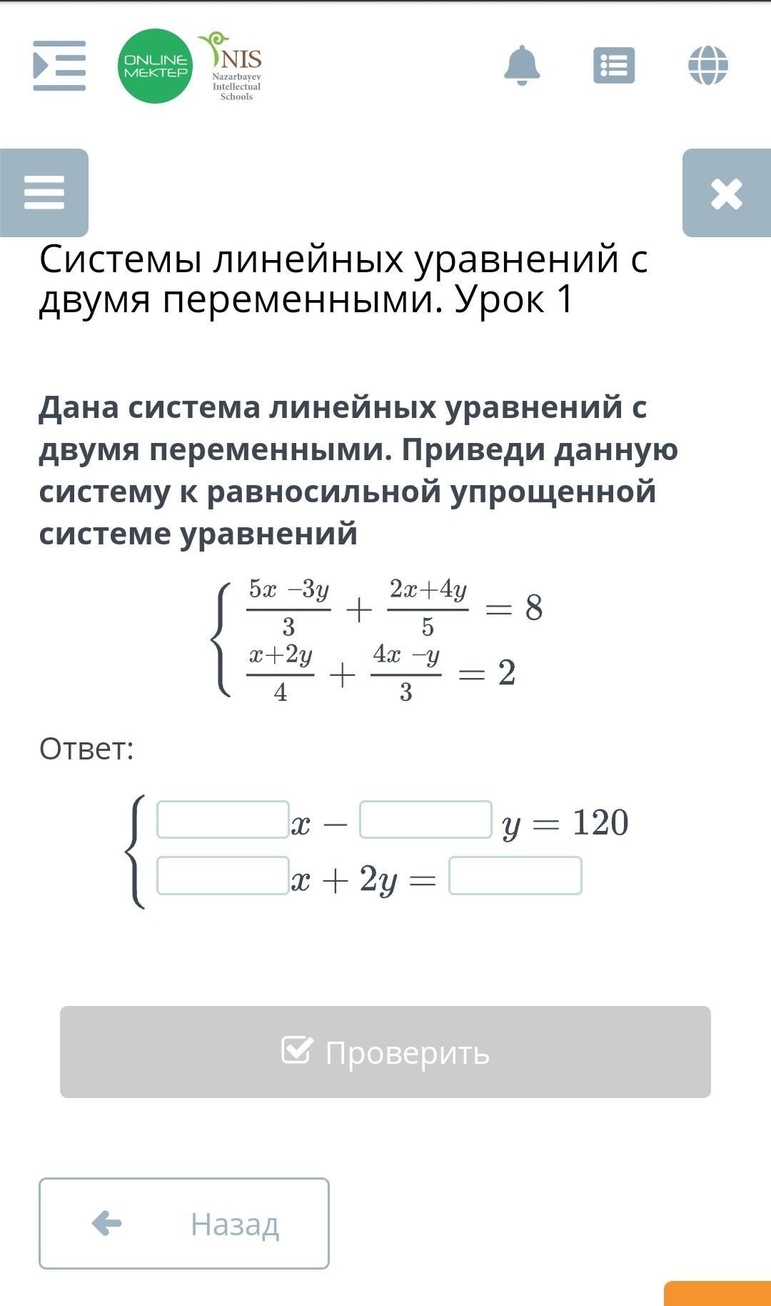 Дана система линейных уравнений с двумя переменными. Приведи данную систему к равносильной упрощенной системе уравнений