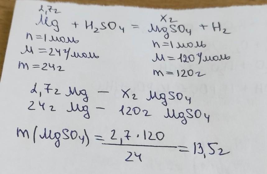 Вычислите массу соли, которая образуется при взаимодействии 2,7 г магния с серной кислотой. *