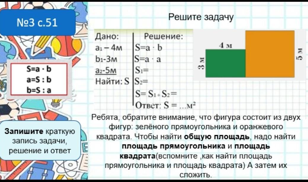 S1 = a × b = 4 × 3 = 12 (м²) - площадь прямоугольника.