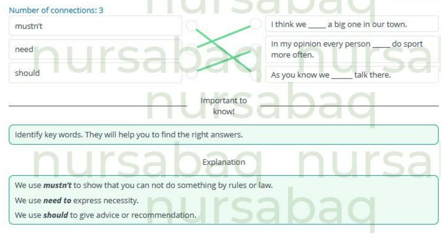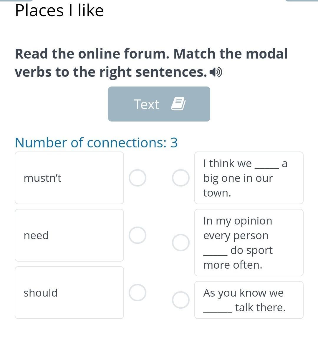 Places I like Read the online forum. Match the modal verbs to the right sentences. Text Number of connections: 3 mustn't I think we big one in our town. In my opinion every person do sport more often. As you know we talk there. a need should