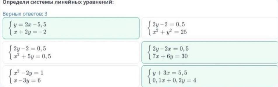 Системы линейных уравнений с двумя переменными. Урок 1 Определи системы линейных уравнений: Верных ответов: 3