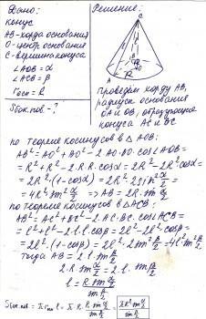 В основі конуса проведено хорду, відстань до якої від центра основи дорівнює m і яку видно із цього центра під кутом 60 градусів. Кут між твірною конуса і площиною цого основи дорівнює 60 градусів. Знайдіть об'єм конуса.