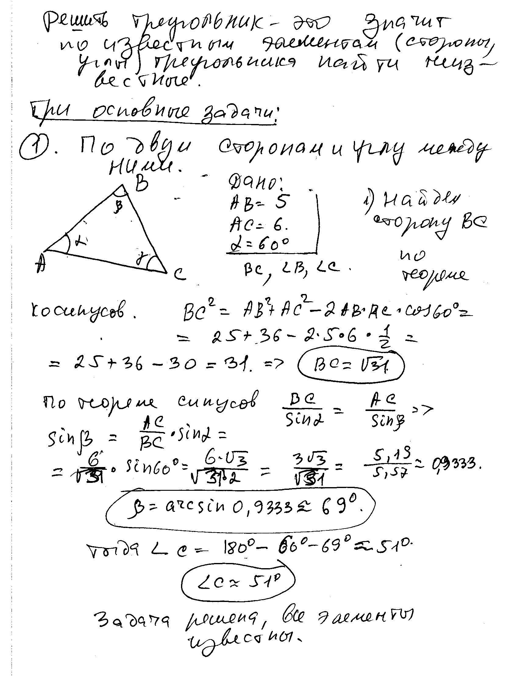 что означает слово "решение треугольника"? сформулируйте три основные задачи на решение треугольника и объясните как они решаются