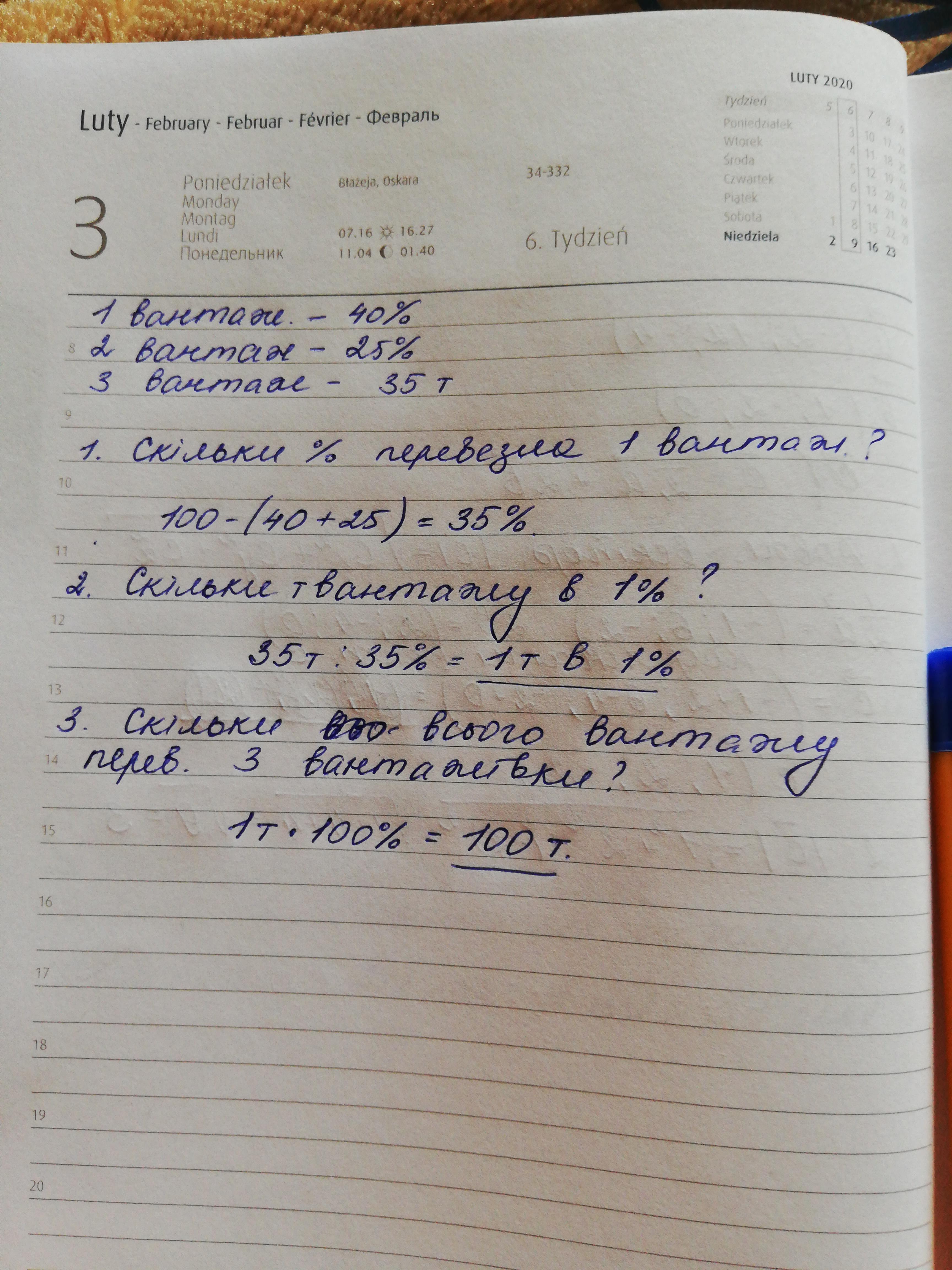 три вантажівки перевезли деякий вантаж .перша вантажівка перевезла 40%усього вантажу друга 25% а третя решту 35т. скільки тонн вантажу було перевезено трьома вантажівками разом
