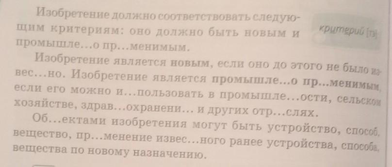 Изобретение является новым, если оно до этого не было извесТно (т потому, что это непроизносимая согласная в корне слова, проверочное весТь) . Изобретение является промышлеННо(это суффикс прилагательных, две н потому, что суффикс енн) прИменимым (это приставка при означает присоединение) , если его можно иСпользовать (это приставка - ис, с потому, что после приставки стоит буква п, которая глухая) в промышлеННости (две н потому, что суффикс енн) , сельском хозяйстве, здравоОхранениИ(о потому, что это Сложное слово образованое с помощью соединительной гласной о) (и, потому, что это окончание у слова на - ие, а у этих слов окончание - е не бывает) и других отрОслях.(о потому, что это корень с чередованием раст рос, после о стоит с)