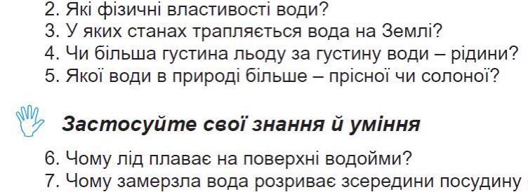 1.(Взял с интернета т.к лень писать)При звичайних умовах вода — прозора рідина без смаку і запаху. У тонкому шарі вона безбарвна, а при товщині більше 2 м має блакитний відтінок.На відміну від інших речовин тверда вода (лід) легше рідкої.