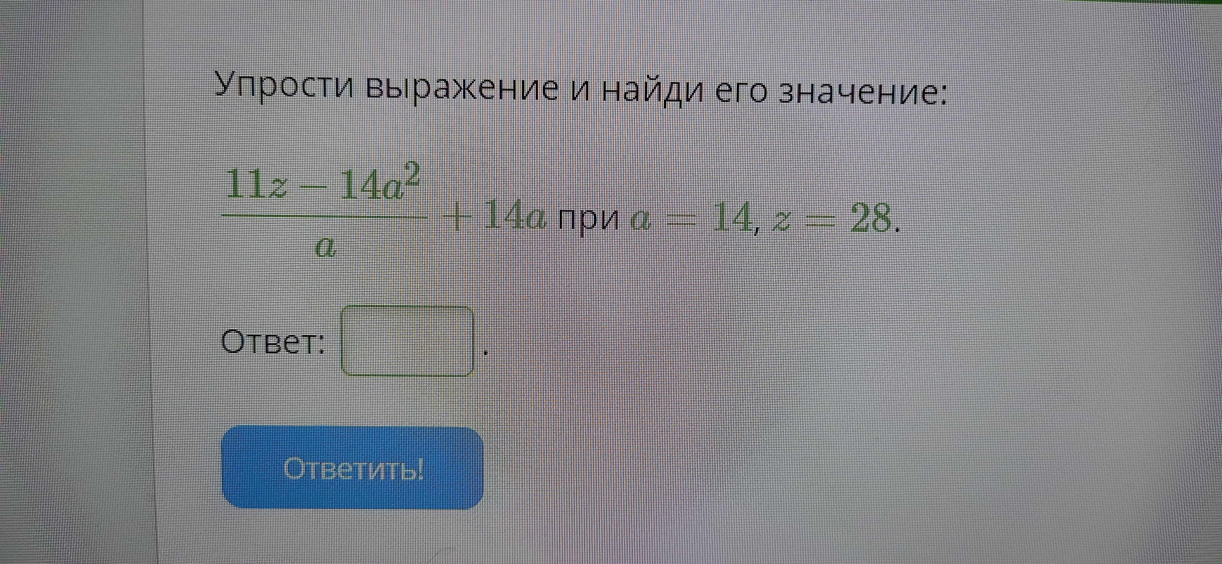 11z - 14a² / a + 14a = 11 * ( 28 ) - 14 * ( 14 )² / 14 + 14 * 14 = 308 - 196² / 14 + 196 / 1 = 308 - 38416 / 14 + 2744 / 14 = -38108 / 14 + 2744 / 14 = -35364 / 14 = - 2526