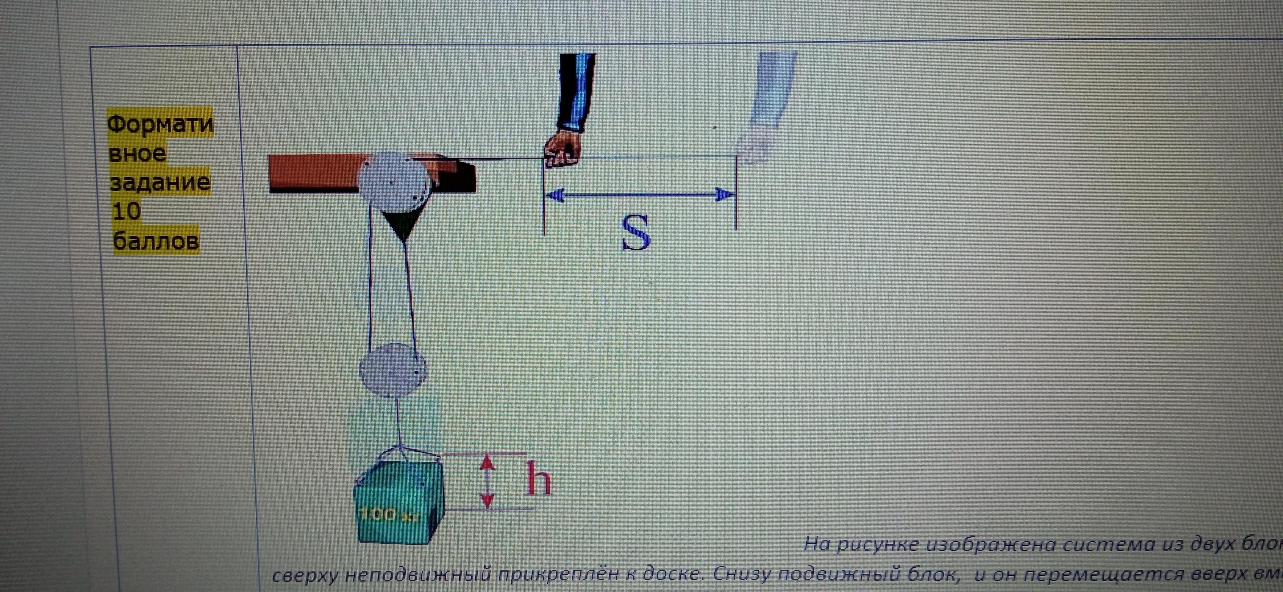 На рисунке изображена система из двух блоков – сверху неподвижный прикреплён к доске. Снизу подвижный блок, и он перемещается вверх вместе с грузом.