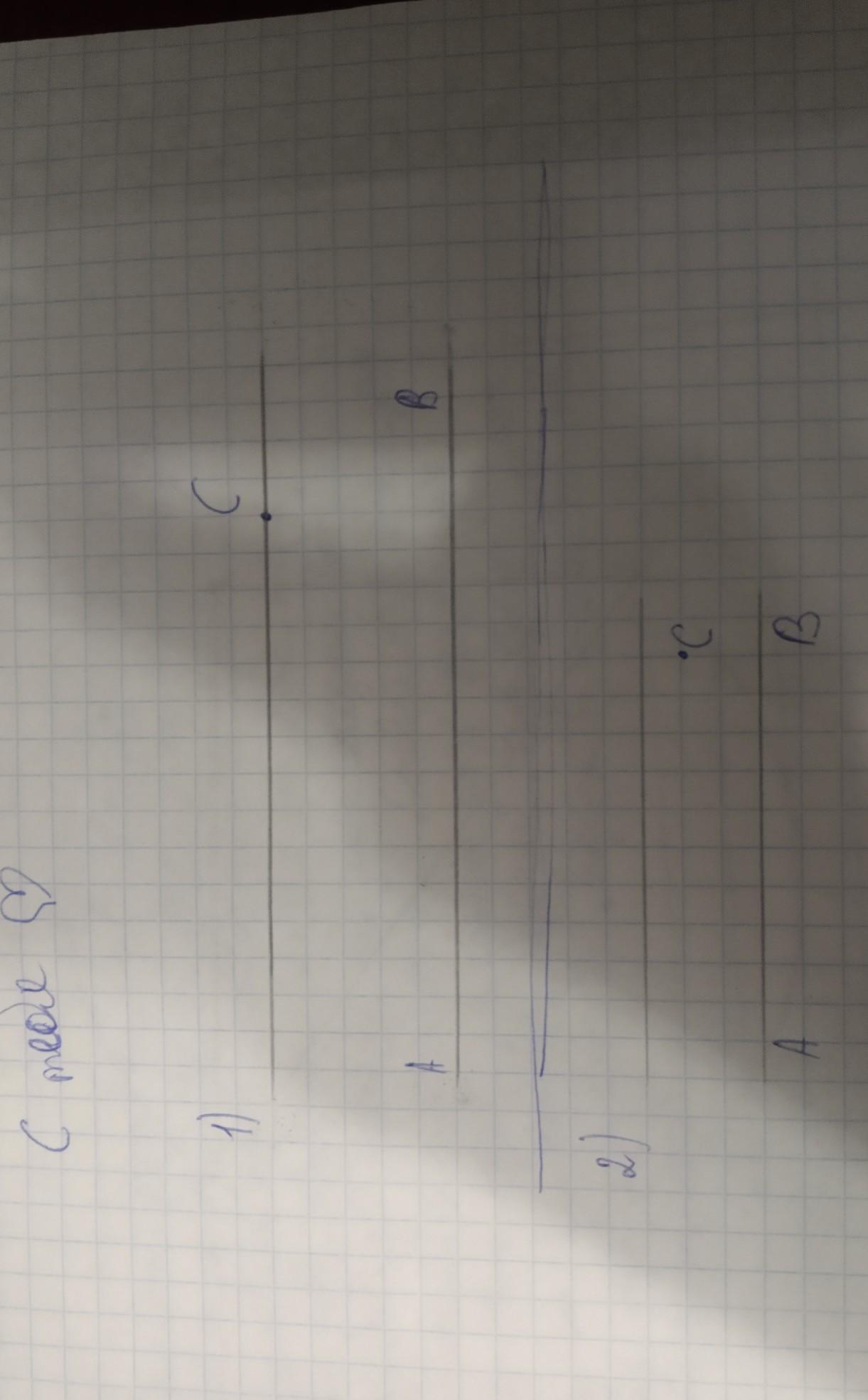 накресліть пряму АВ і позначте точку С поза прямою. Побудуйте пряму, паралельну прямій АВ яка 1)проходить через точку С 2) не проходить через точку С