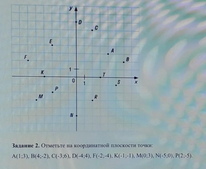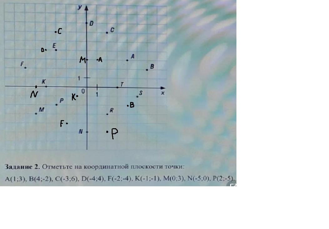 Отметье на координатной плоскости точки: А(1;3), В(4;-2), С(-3;6), D(-4;4), F(-2;-4), K(-1;-1), M(0;3), N(-5;0), P(2;-5).