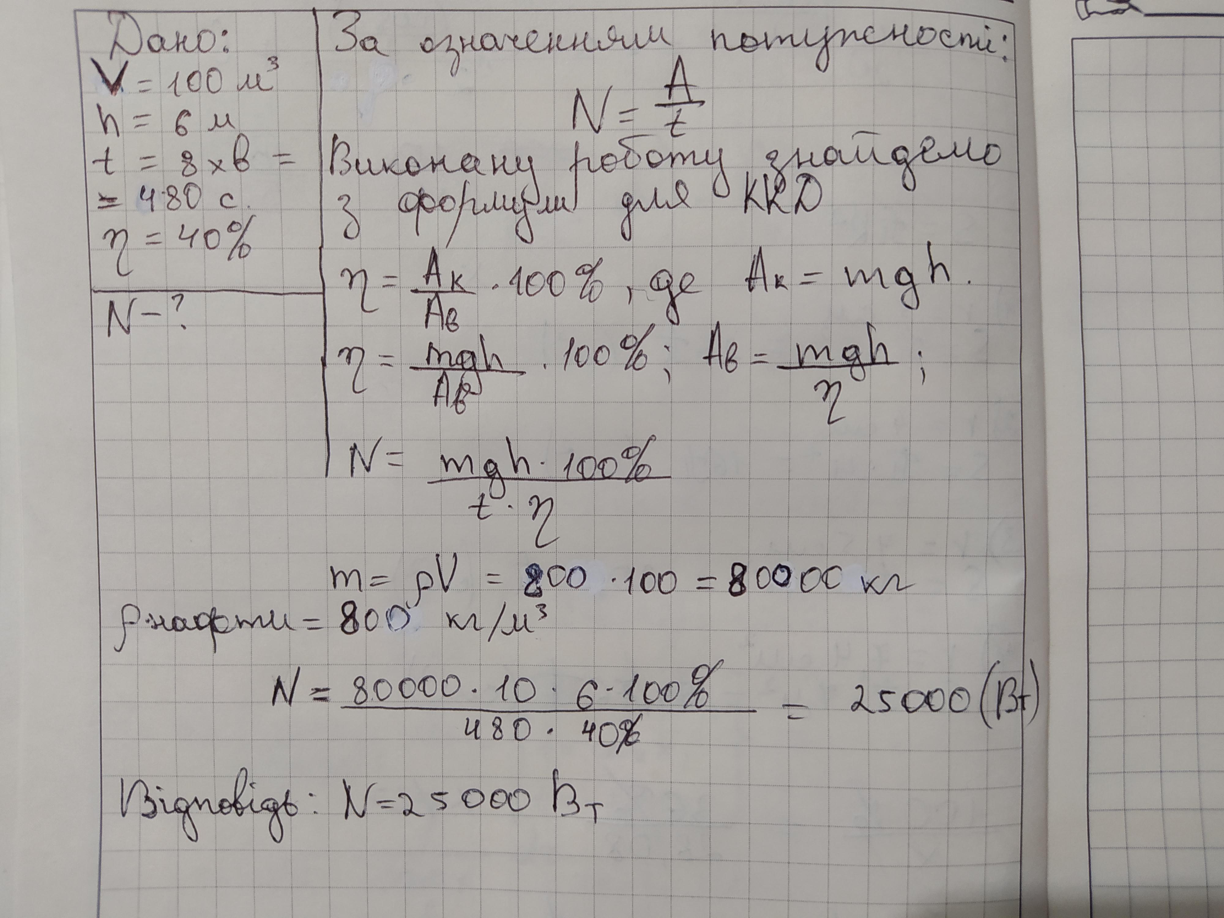 Яку потужність має насос, що рівномірно піднімає 100 м3 нафти на висоту 6 м за 8 хв? ККД насоса становить 40 %.