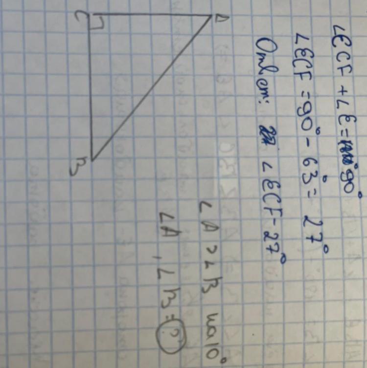 Итак, угол В= 40 градусов, тогда угол А=40+10=50 градусов