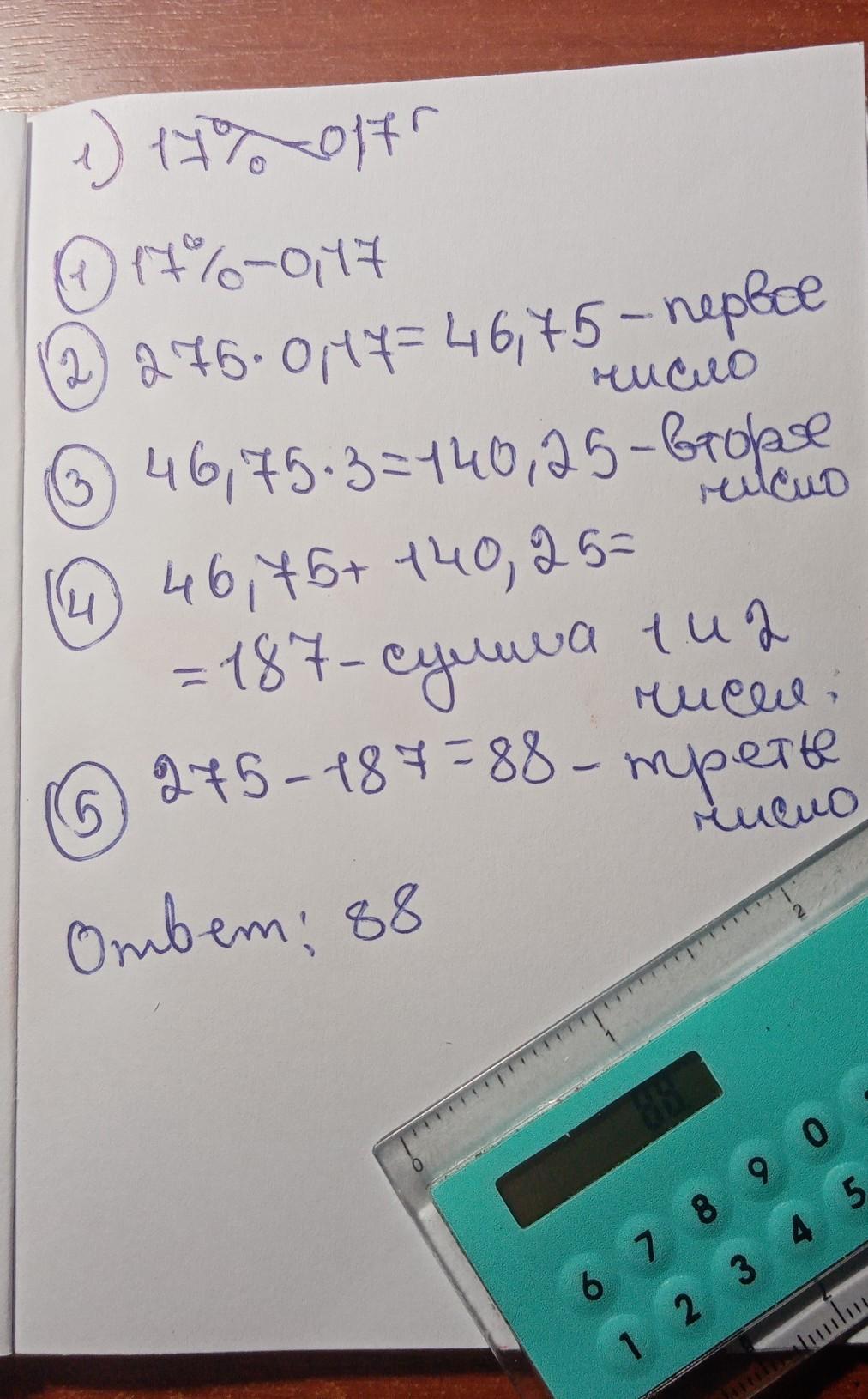 Сумма трёх чисел равна 275. Первое число составляет 17 % этой суммы. Второе число в 3 раза больше первого. Найди третье число.
