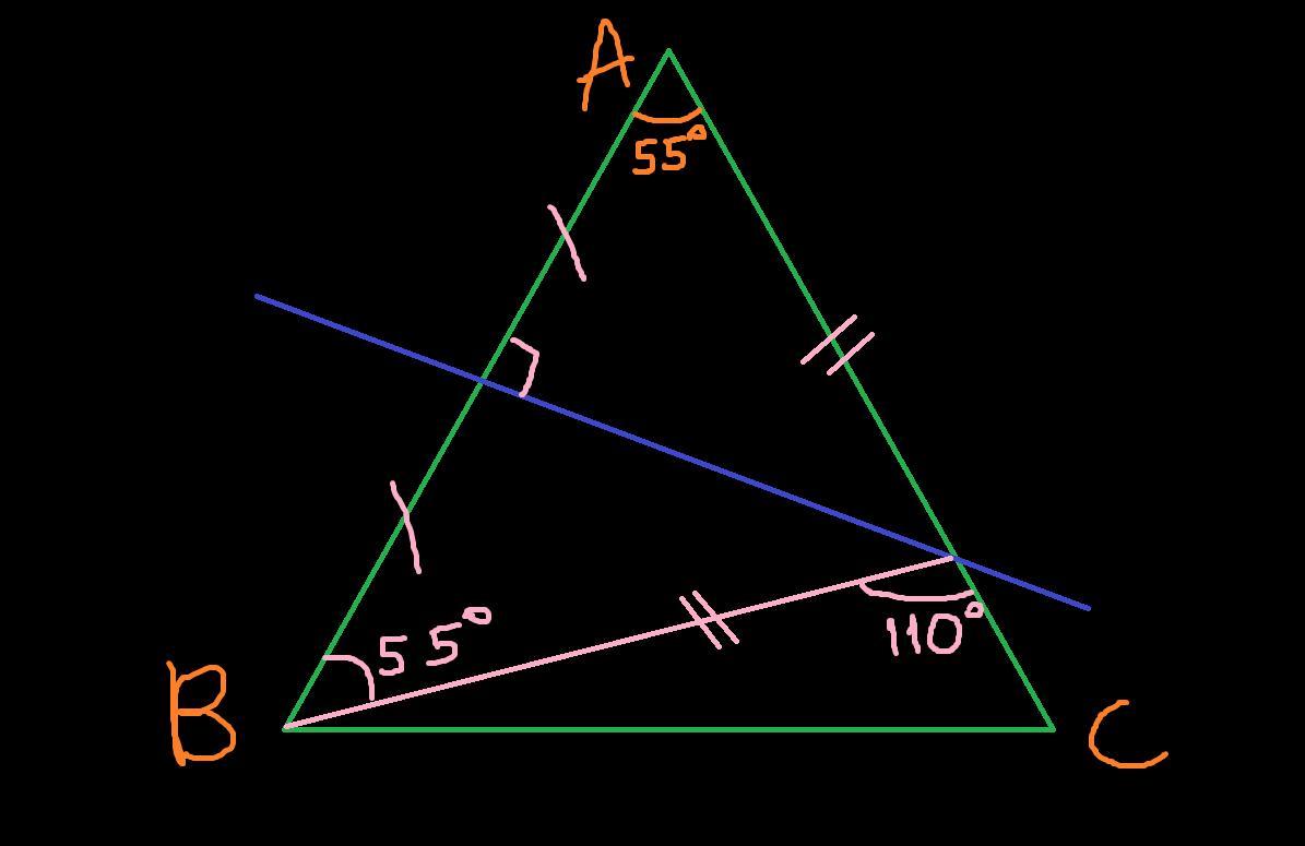 Также они образуют один большой равнобедренный треугольник BAD. Он такой в связи с тем, что по доказанному BD and AD равны. Следовательно углы при основании тоже равны, то есть по 55 градусов.