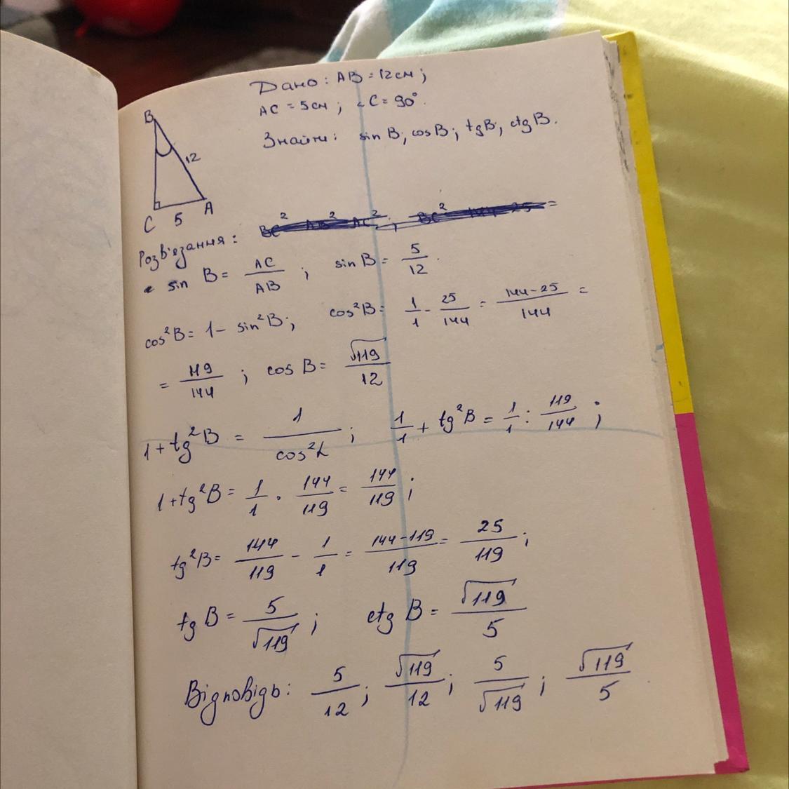 каьети прямокутного трикутника =5см і 12см. Обчисліть синус косинус тангенс котангенс гострого кута цього трикутника