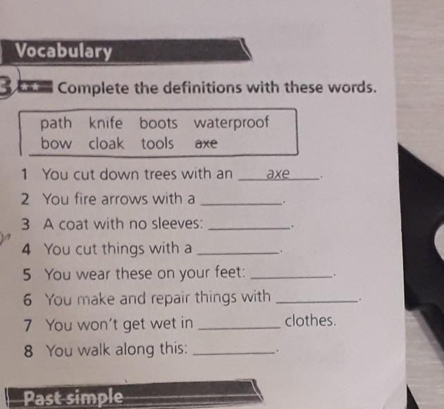 2.( bow),3 (cloak)4.( knife)5.(boots)6.(tools)7.(waterproof)8.(path)-Вроде оно