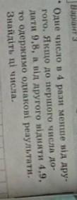 Одне число в 4 раза менше від другого. Якщо до першого числа додати 9,8 ,а від другого відняти 4,9 то одержимо однакові результати. Знайдіть ці числа.