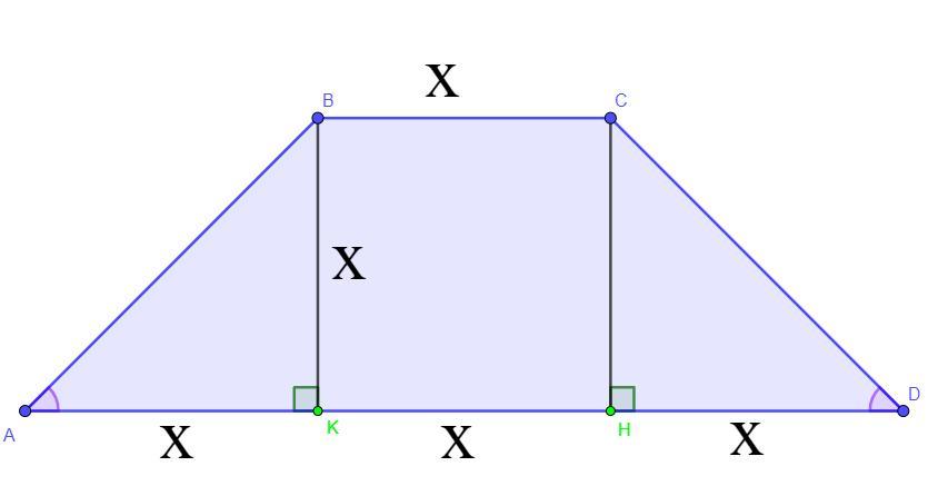 Треугольник ΔCHD = ΔBAK (прямоугольные треугольники) по катету и острому углу так как BK = CH, как высоты, по свойствам трапеции, а угол ∠BAD = ∠CDA = 45° по условию.
