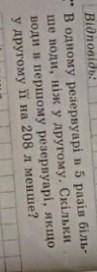 В одному резервуарі в 5 разів більше води, ніж у другому. Скільки води в першому резервуарі, якщо у другому її на 208л менше?