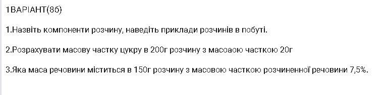 1.Компонентами розчину є: розчинник та розчинена речовина. Кожний розчин складається з розчинника і розчиненої речовини. Розчинником називають звичайну речовину, яка служить середовищем для розчиненої речовини і в чистому вигляді перебуває в тому ж агрегатному стані, що й утворюваний розчин