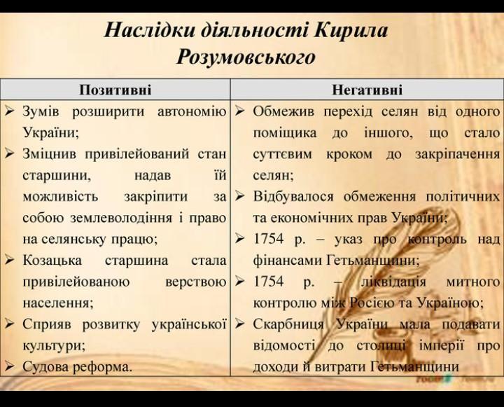 Таблиця: Позитивні і негативні наслідки гетьманування Кирила Розумовського.