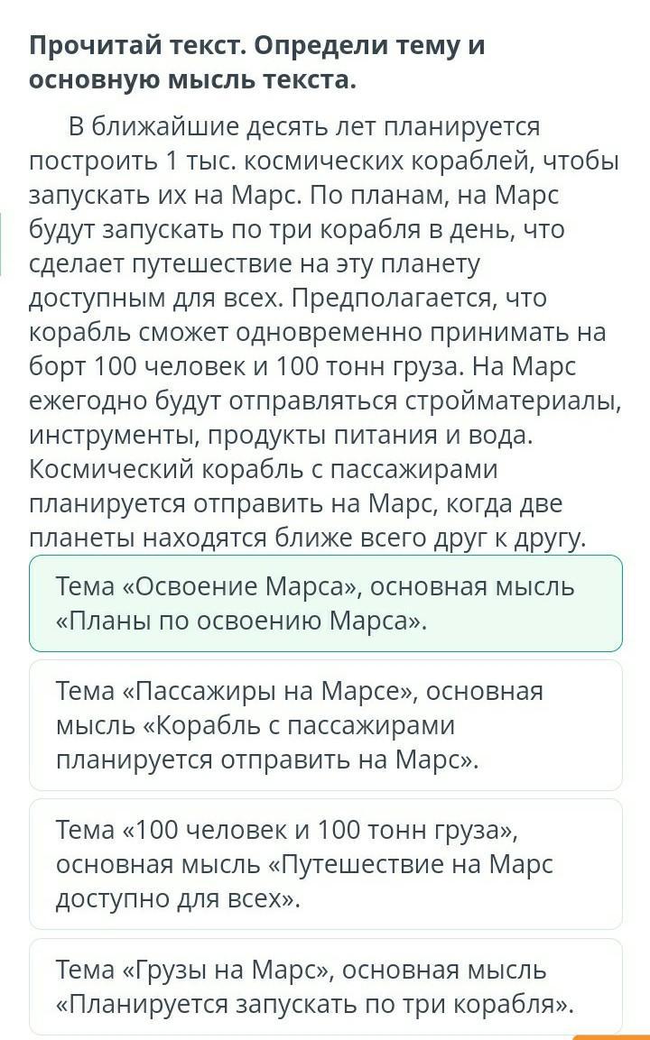 Тема «Освоение Марса», основная мысль «Планы по освоению Марса».
