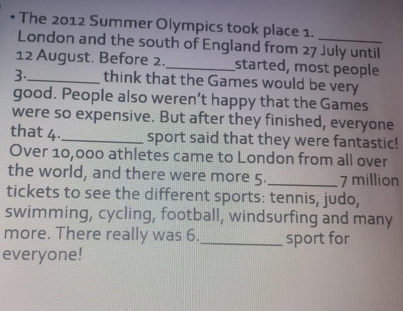 Over 10,000 athletes came to London from all over the world, and there were more 5.. tickets to see the different sports: tennis, judo, 7 million swimming, cycling, football, windsurfing and many more. There really was 6. everyone!