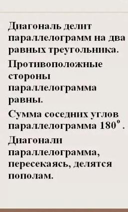 Признаки параллелограмма: — две противолежащие стороны равны и параллельны, — противолежащие стороны попарно равны, — диагонали пересекаются и точкой пересечения делятся пополам, — каждая диагональ делит четырехугольник на два равных треугольника.